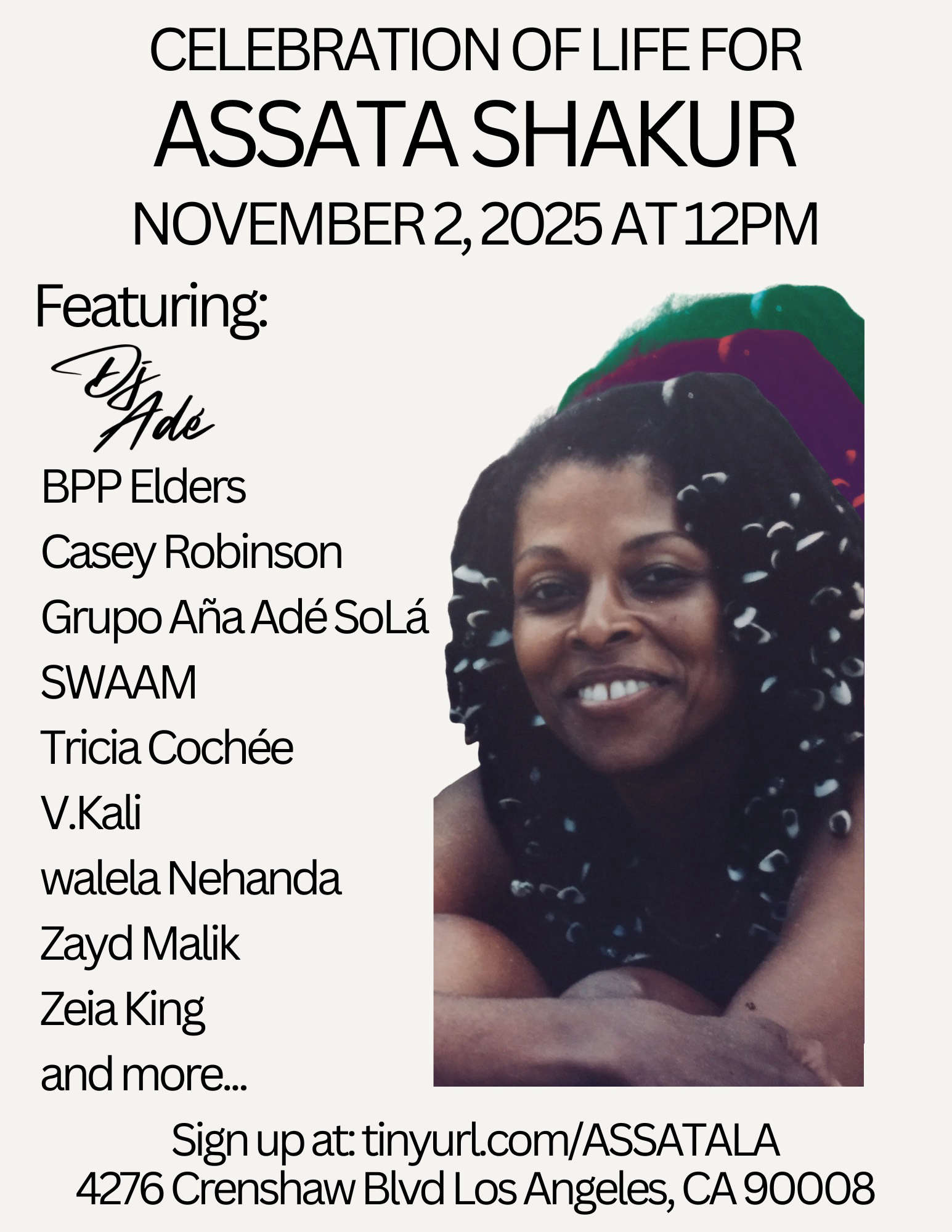 Celebration of Life for Assata Shakur Nov. 2, 2025 Community Owned Center In Leimert Park Noon-3pmNovember 2nd 2025
